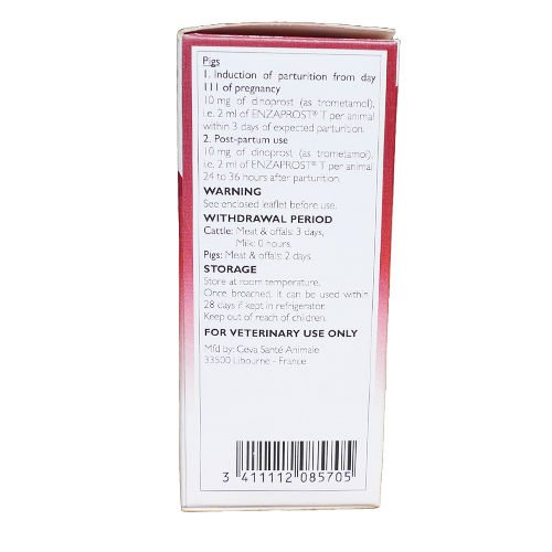 For cattle, 25 mg of dinoprost (tromethamol), i.e. 5 ml per animal. Withdrawal period: 0 day (milk) / 3 days for cattle and 2 days for swine (meat & offal)