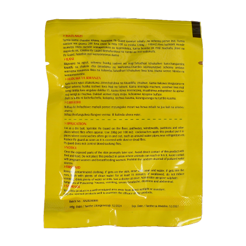 Use as dry bait. Sprinkle fly guard on the floor, pathways, window sills, partitions and other places where flies often appear. Use 200g per 100m2 , for cockroaches put this product in places where cockroaches often go in and out such as around pipes , near refrigerators etc.