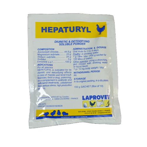 Hepaturyl is indicated for its diuretic and detoxifying effects incase of heptic and renel insufficiencies, food or drug poisoning, as a complement to antibiotic and sulfonamid treatments, unbalanced feed, serious stress, high production periods.